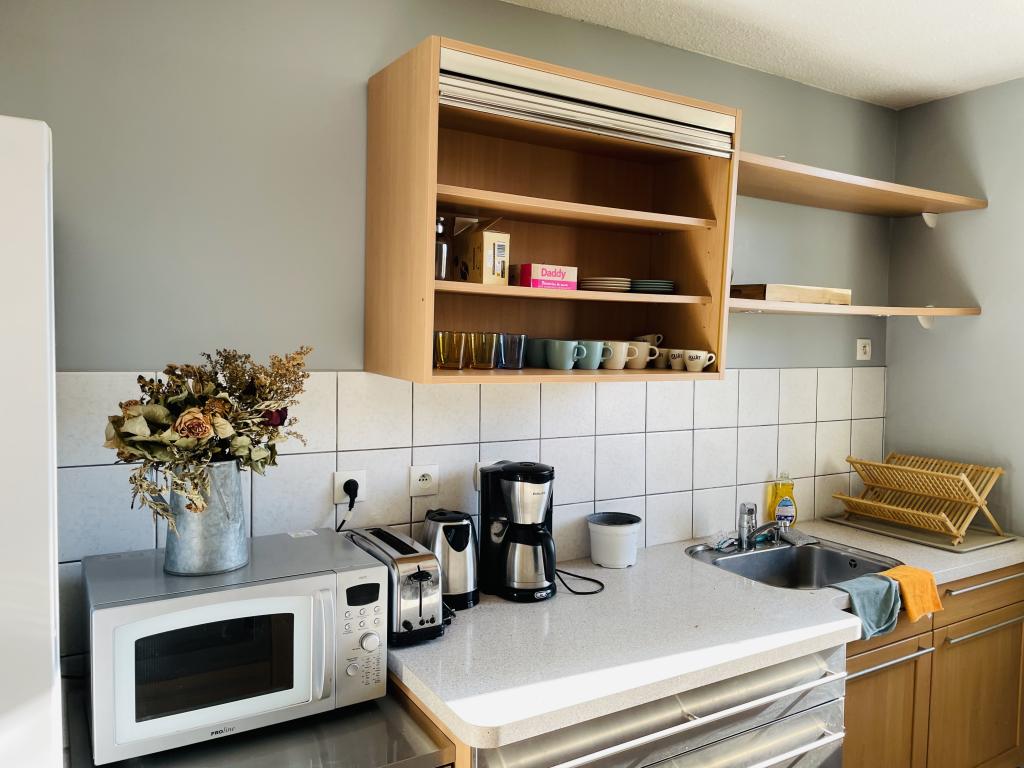 Cuisine équipée (cuisinière avec four, four micro-onde, réfrigérateur-congélateur, lave-vaisselle, hotte). Grande place de parking privative devant entrée résidence (parking fermé).