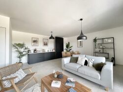 Un salon / séjour lumineux de 26 m² avec cuisine américaine équipée, ouvrant sur une terrasse d'environ 45m²,