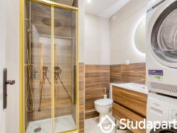 La salle d'eau est élégante et pratique, équipée d'un sèche-serviettes pour un confort optimal, et vous apprécierez les nombreux rangements intégrés pour une organisation impeccable.