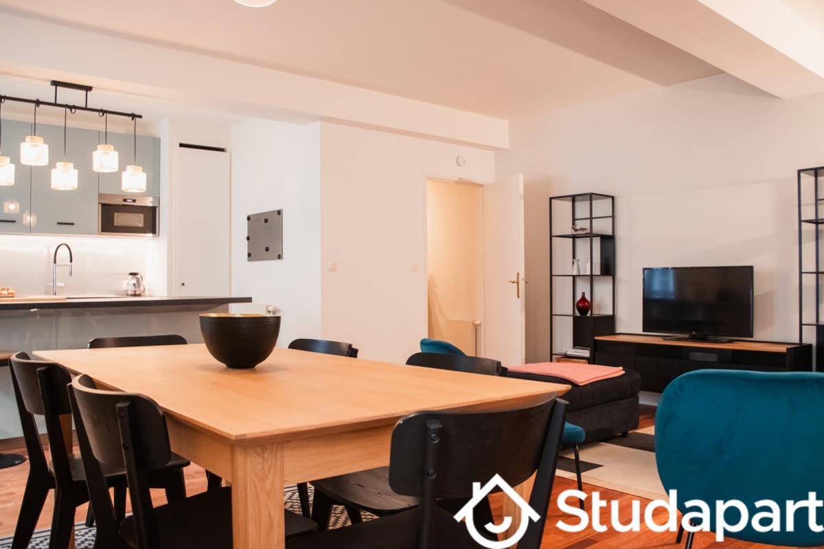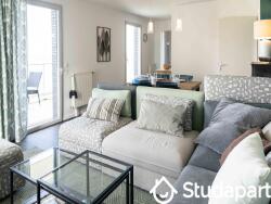 - un séjour spacieux et lumineux avec un grand canapé en U, une table basse, une table de salle à manger pour 6 personnes, une TV, internet/wifi et un long balcon de 19m² filant le long du séjour et de la cuisine,