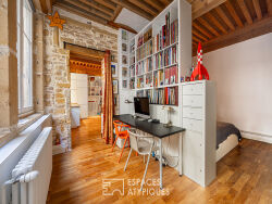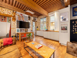 Entre la place des Terreaux et l'église Saint-Nizier, à quelques pas des quais de Saône, cet appartement de 55m² prend place au 1er étage d'un immeuble ancien au cachet préservé, dans un secteur prisé du 1er arrondissement de Lyon. Rénové avec soin, ce lieu de vie singulier conjugue avec harmonie authenticité et modernité. Murs en pierre apparente, plafond à la française et belles hauteurs sous plafond témoignent de son âme d'origine, sublimée par une rénovation sobre et élégante. L'entrée s'ouvre sur une belle pièce de vie, orientée sur une paisible cour intérieure. La cuisine ouverte, moderne et fonctionnelle, se fond parfaitement dans cet espace convivial. Côté nuit, une astucieuse bibliothèque sur mesure permet de distinguer l'espace chambre de celui dédié au bureau, créant ainsi deux univers distincts et fonctionnels. Une salle d'eau moderne, un dressing bien pensé et des toilettes indépendantes viennent compléter cet agencement optimisé. Adresse confidentielle, volumes singuliers, atmosphère intimiste : ce bien séduira les amoureux de cachet en quête d'un lieu unique au coeur de la ville. Bien soumis au statut de la copropriété : 18 lots Charges annuelles : 900 euros CLASSE ENERGIE : C / CLASSE CLIMAT : C Montant moyen estimé des dépenses annuelles d'énergie pour un usage standard, établi à partir des prix de l'énergie de l'année 2021 : entre 520 euros et 750 euros Contact : Adrien - 06 09 55 70 81 Copropriété de 18 lots (Pas de procédure en cours). Charges annuelles : 900 euros. Adrien AUGIER (EI) Agent Commercial - Numéro RSAC : 909 000 945 - LYON.
