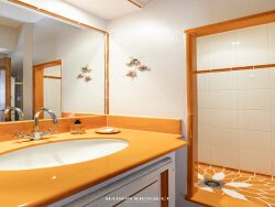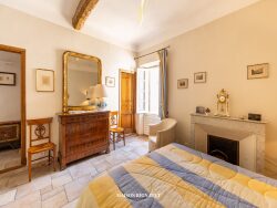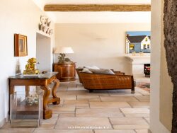 L'espace s'ouvre sur un vaste couloir desservant le coin nuit avec deux chambres en suite, chacune avec salle d'eau et toilettes indépendants. La pièce de réception se compose d'un double salon avec coin repas et se prolonge vers la cuisine indépendante semi ouverte. Les volumes sont généreux, les poutres apparentes et la cheminée en pierre est fonctionnelle. Les doubles fenêtres laissent entrer la lumière et offrent une jolie vue mer.