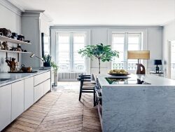 Ce prestigieux appartement riche en histoire, fut rénové avec des matériaux de qualité, il possède une hauteur sous plafond de 3m40, du parquet conservé en point de Hongrie, des moulures au plafond, des boiseries conservées, des cheminées en marbre.