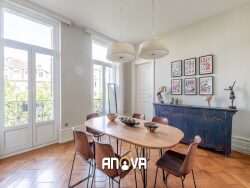 Cet appartement bourgeois, situé au deuxième étage, conjugue élégance, charme de l'ancien, volumes généreux et confort moderne avec sa spacieuse cuisine ouverte centrale.