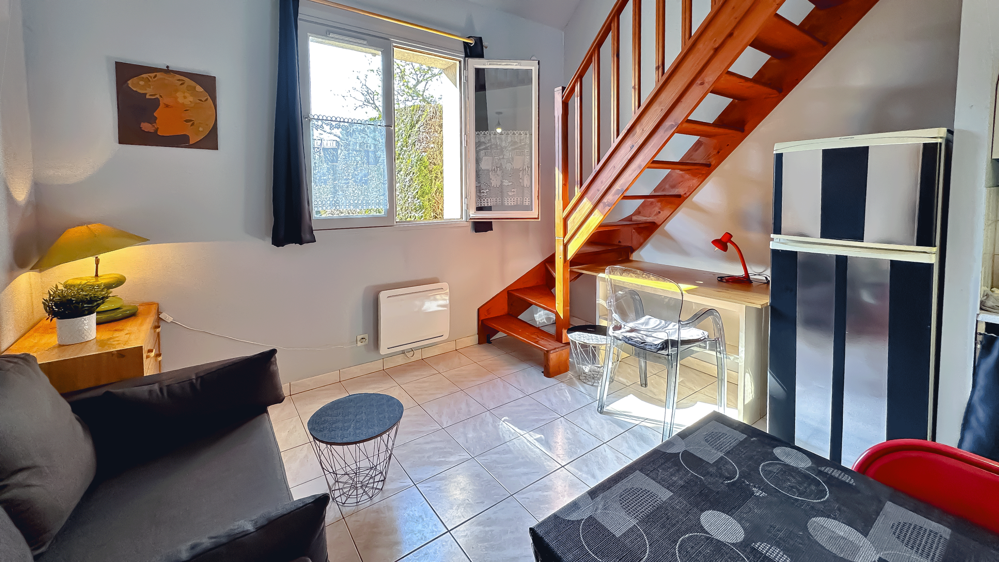 Le duplex se compose, D'une pièce de vie lumineuse D'un coin cuisine aménagée et équipé D'une salle d'eau Ainsi que d'une chambre en mezzanine