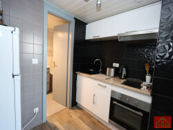 Au 1er étage, l'entrée avec coin vestiaire nous convie vers l'étage supérieur où l'on découvre cette pièce de vie accueillante avec poutres apparentes. On dispose d'un espace salon avec canapé convertible et d'un coin repas. La cuisine équipée est fonctionnelle dans un esprit contemporain. La salle de bain aux tons actuels met une baignoire à disposition, un large meuble avec vasque, un WC et un coin buanderie. On trouve encore la chambre avec meubles de rangement et tout le nécessaire.