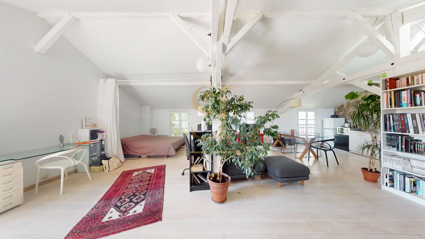 A l'étage, grand palier mezzanine qui sert de bureau et grande chambre avec dressing.