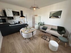 Il offre une cuisine aménagée et équipée ouverte sur belle pièce de vie, une chambre, placards, une salle d'eau avec wc.