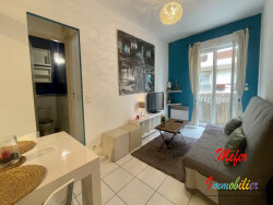 CANET PLAGE - ENTRE PORT ET PLACE MEDITERRANNEE A louer à l'année, appartement meublé de 39m² au 1er étage d'une résidence sans ascenseur. Il dispose d'une jolie cuisine aménagée et équipée (four, plaque induction, hotte, réfrigérateur avec congélateur, cafetière, micro-ondes), d'un séjour avec canapé et TV, une chambre avec lit 140x190cm et placard, SDB avec baignoire, lavabo et placard. Cet appartement dispose d'un balcon avec très belle vue mer latérale ainsi que d'une place de parking privée couvert dans le garage commun de la résidence et d'un cellier. L'appartement sera climatisé!