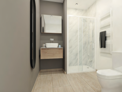 Un meuble vasque suspendu et une douche extra-plate,