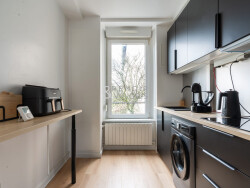 L'entrée dessert un espace salon, ainsi qu'une cuisine entièrement équipée.