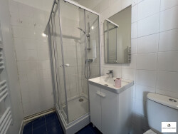 Appartement au 1er étage en centre-ville comprenant une entrée, une cuisine équipée ouverte sur le séjour-salon, deux chambres en enfilades et une salle d'eau avec wc. Chauffage électrique