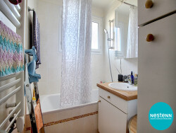 Situé au 2ème étage (sans ascenseur), cet appartement traversant avec vue dégagée des deux côtés, se compose : d'une entrée avec rangements, un séjour donnant sur balcon orienté Ouest, une cuisine aménagée et équipée (meubles hauts, meubles bas, plaques, hotte, évier), deux chambres avec rangements, une salle de bains (baignoire, vasque avec meuble bas et meuble de rangement) et un WC séparé.