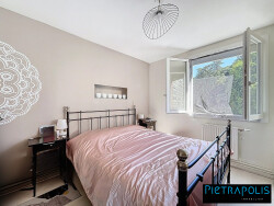 Les huisseries ont été refaites en PVC double vitrage, avec volets roulants électriques et lames orientables pour la cuisine et le salon. Les fenêtres sont oscillo battantes. La chaudière gaz est neuve.