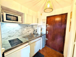 Une entrée avec un coin kitchenette, Une salle de bain avec wc et espace lave linge La pièce principale lumineuse avec un coin cabine fermé Une belle loggia fermée, exposée Sud-OUEST, offrant une vue dégagée, et baignée de lumière naturelle.( avec sa petite cerise sur le gateau : vue mer :) avec store banne
