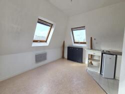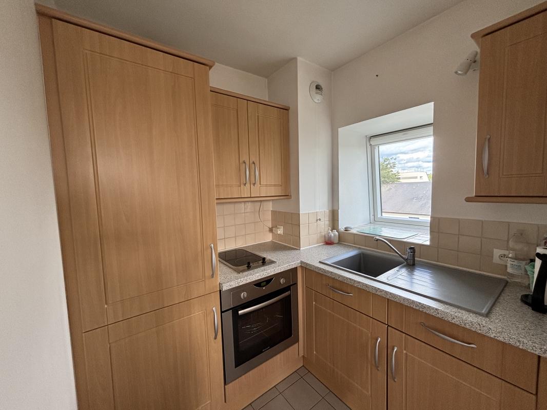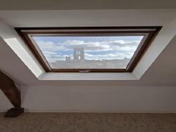 L'appartement se compose d'une entrée avec placard, d'une pièce de vie claire et bien agencée, dotée de grandes fenêtres de toit offrant une vue dégagée sur la ville. Le coin cuisine est aménagé et équipé. La salle de bains est équipée d'une baignoire, d'un meuble vasque et de WC.
