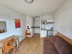 L'appartement comprends une kitchenette aménagée et équipée, ouverte sur le salon/séjour meublé d'un canapé, d'un bureau et d'une table avec deux chaises, une chambre avec lit, une salle de bain avec WC.