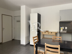Appartement composé d'un hall d'entrée, une cuisine ouverte sur le séjour, une chambre et une salle de bain avec toilette.