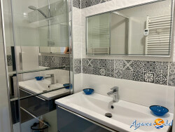 L'appartement propose une pièce de vie lumineuse, prolongée par une loggia vitrée exposée Est, offrant une vue dégagée sur la Marina et la Mer, idéale pour profiter des levers de soleil.