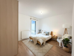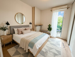 L'appartement dispose de deux chambres, chacune avec un accès direct à la terrasse, apportant une belle continuité entre intérieur et extérieur. Une salle d'eau ainsi qu'un toilette indépendant complètent ce bien. Conforme aux normes PMR, il garantit un confort d'accès optimal.