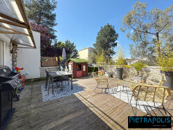 L'espace de vie, d'une superficie de 37 m² et habillé d'un parquet chaleureux, comprend une cuisine ouverte sur le séjour, donnant accès à une vaste terrasse aménagée de 44 m². Un WC indépendant complète cet espace.