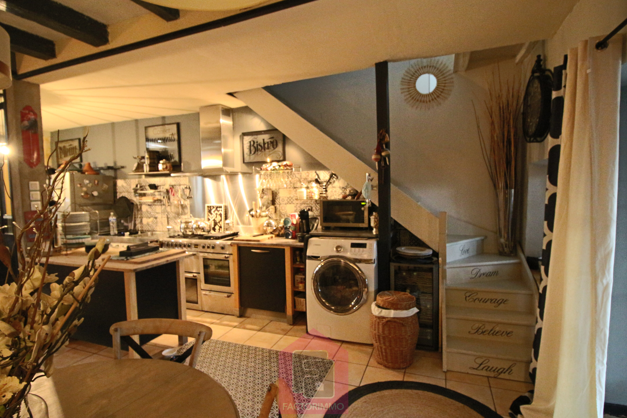 Appartement T3 de 82,40m2 habitables, aménagé de plain-pied avec terrasses + jardin Une cuisine de 10m2, évier 2 bacs monté sur meuble, sol parquet, porte-fenêtre ouvrant sur terrasse, Une salle de séjour et salon de 25m2 avec placard rustique, sol plancher, 2 fenêtres, une porte-fenêtre ouvrant sur terrasse. Une grande chambre de 19m2 avec cheminée, 2 fenêtres, sol plancher. Une chambre de 15,66m2, avec placard rustique, cheminée, sol plancher, 2 porte-fenêtre, dont une ouvrant sur une terrasse fermée de 11,78m2. Une salle d'eau, cabine de douche, vasque sur meuble, WC séparé.