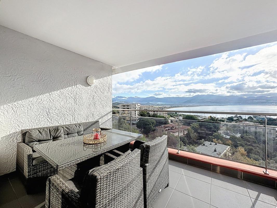 La terrasse offre une belle vue dégagée sur la mer et les montagnes, idéale pour profiter d'un cadre de vie apaisant.