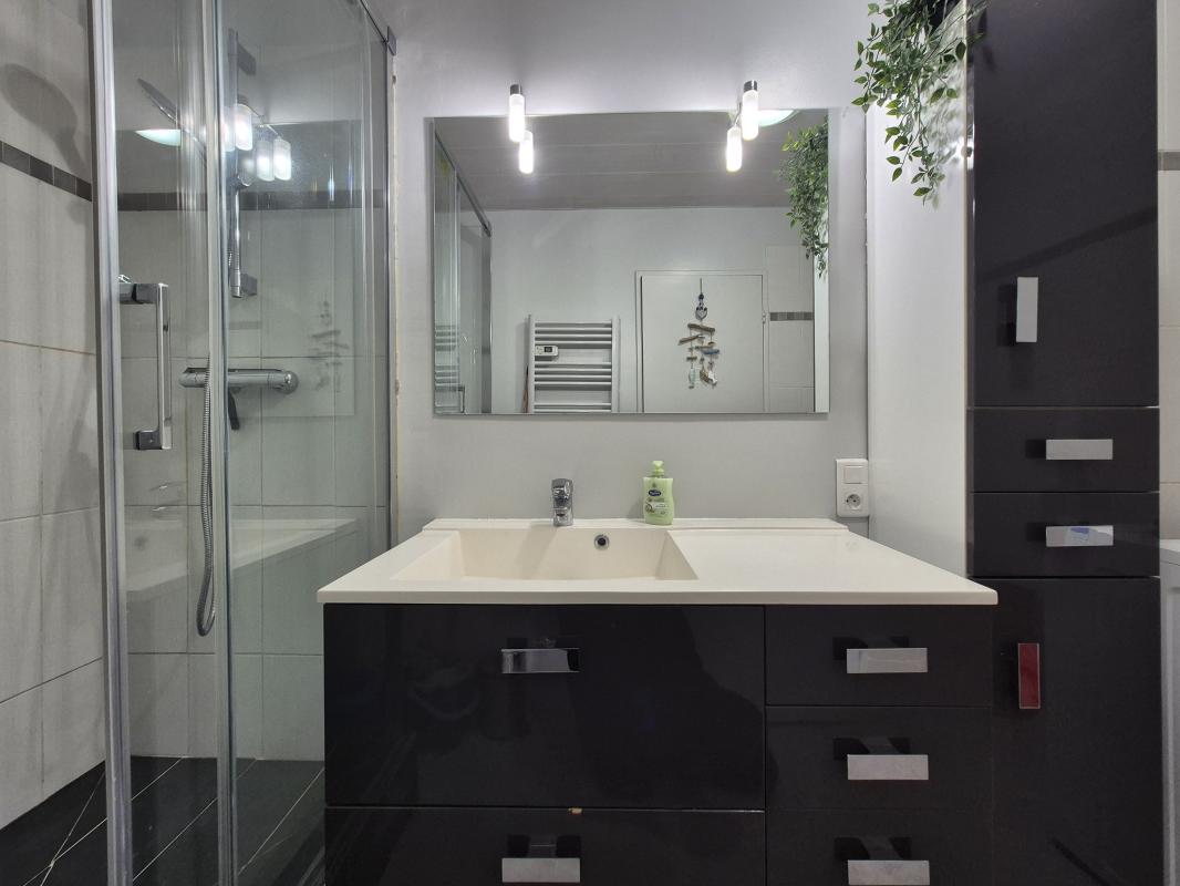 - Salle d'eau : douche, lave linge, lavabo, rangements.