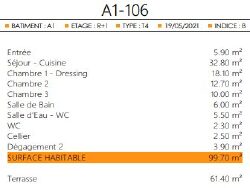 L'entrée avec placard s'ouvre sur une pièce de vie de 33 m² prolongée par une vaste terrasse de plus de 60 m², idéale pour profiter des beaux jours. L'espace nuit comprend trois chambres avec placards, dont une suite parentale avec dressing, salle d'eau et WC privatif. Profitez également d'une salle de bain, d'un WC indépendant ainsi que d'un cellier.