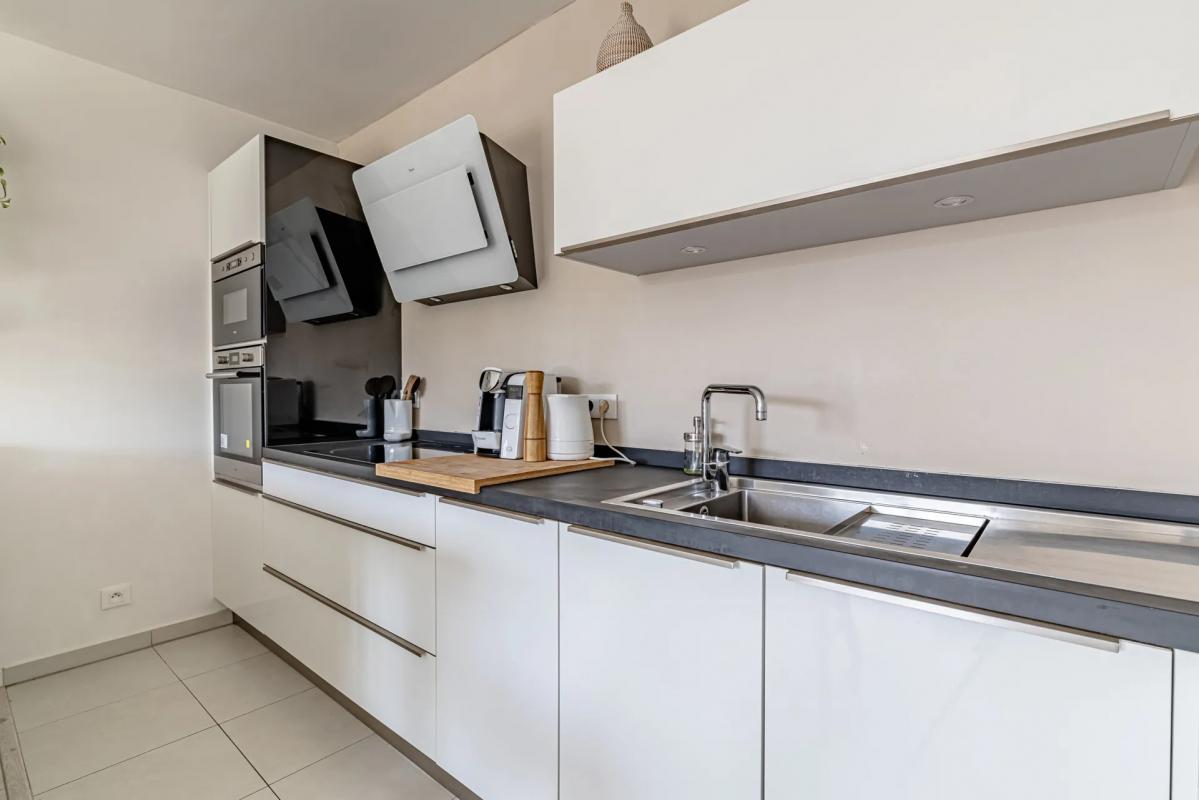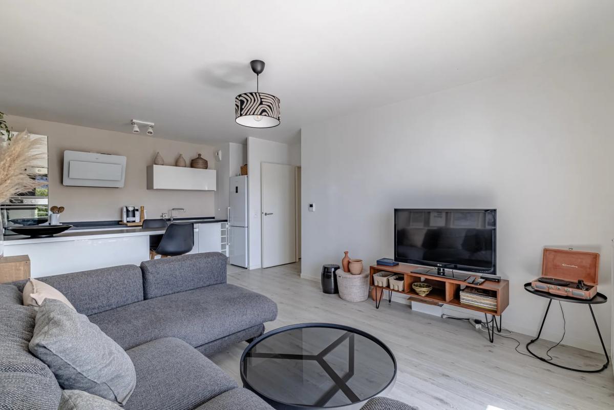 Une entrée avec placard de rangement donnant sur un vaste salon/séjour et terrasse au calme (donnant sur cour intérieure) Cuisine semi-ouverte, entièrement équipée et meublée Une salle de bains fonctionnelle Un WC séparé À l'étage : deux chambres de 11,65 m2 et 10,77 m2 Une salle d'eau Un WC De nombreux rangements.