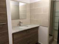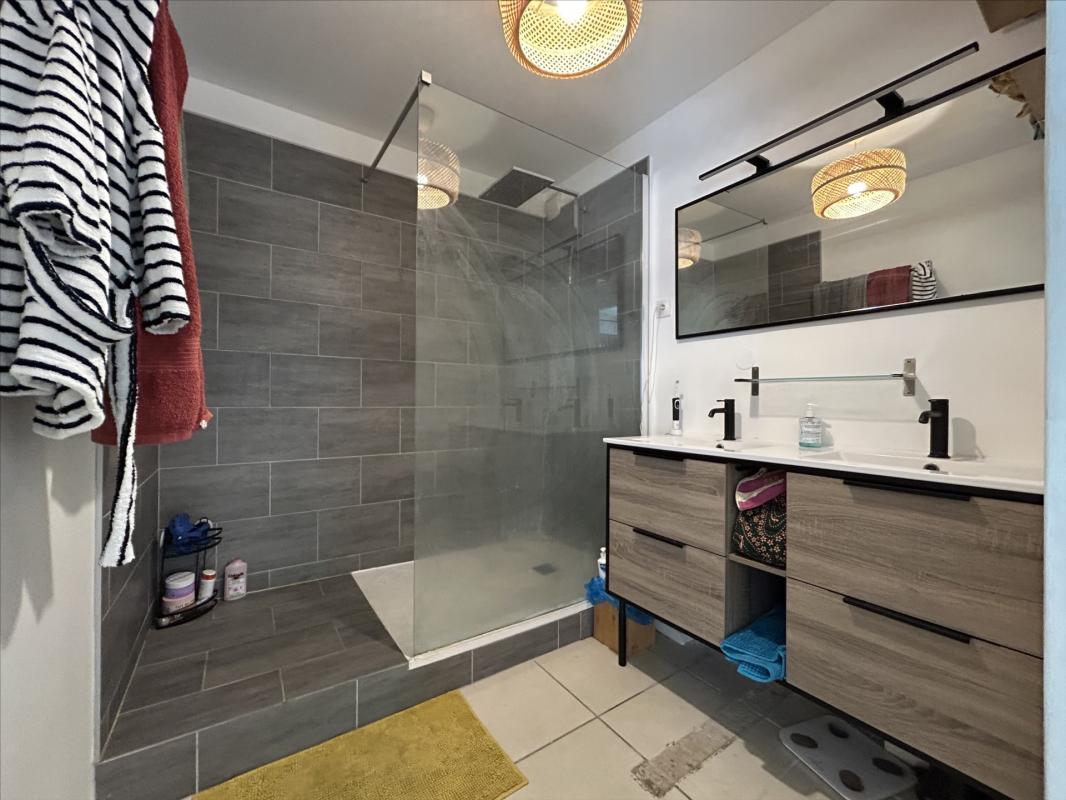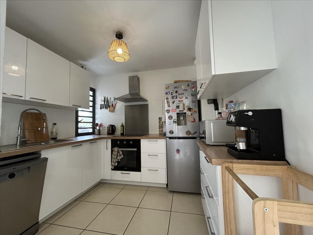 L'appartement est constitué : d'une entrée, une cuisine aménagée ouverte sur un grand séjour, une varangue, un dégagement avec placard, un wc séparé, une chambre avec placard, une salle d'eau avec douche, à l'étage : un dégagement, une salle de bains avec baignoire, une chambre avec placard et balcon, une chambre climatisée avec balcon et une grande terrasse d'environ 20 m2, pour compléter le bien 2 parkings privés. Chauffe eau solaire. Libre de toute occupation.