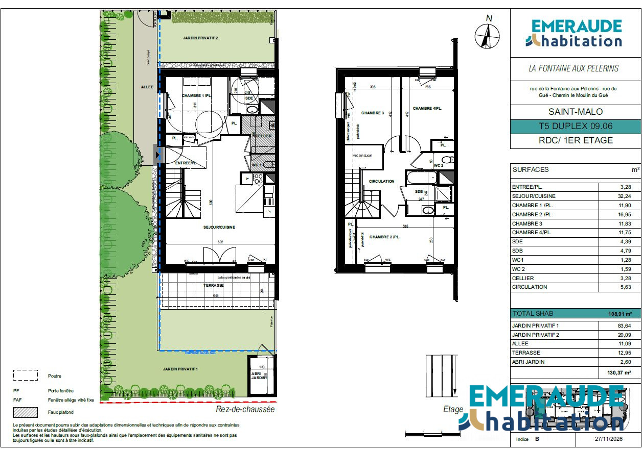 Appartement T2 BRS Emeraude Habitation vous propose ce bel appartement T4, situé dans une résidence neuve LA FONTAINE AUX PELERINS, conforme aux normes RE 2020, garantissant performance énergétique, confort thermique et économies d'énergie. Idéalement situé à proximité immédiate des commerces, services et des plages. En rez de jardin privatif, ce logement d'une surface de 97.31 m² comprend une entrée, un cellier, un séjour lumineux avec cuisine ouverte, offrant un espace de vie convivial et fonctionnel donnant sur une terrasse de 9.45 m² et d'un jardin de 68.08m² avec abri de jardin. Trois belles chambres avec placard dont une donnant sur une salle d'eau privative, salle de bain, wc indépendant. En complément : Deux places de stationnement privative en sous-sol Local deux-roues sécurisé au sein de la résidence Cet appartement allie modernité, fonctionnalité et qualité de vie. Une opportunité à découvrir sans tarder à Saint-Malo