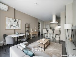 Le séjour lumineux de 26 m², exposé Est, avec un accès direct à l'extérieur, inclus une cuisine ouverte entièrement équipée et aménagée.