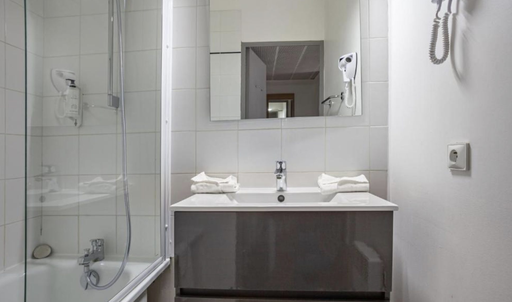 Vous trouverez ensuite une salle d'au fonctionnelle avec douche, WC et vasque. Ainsi qu'un meuble de rangement et un grand miroir pour votre confort.
