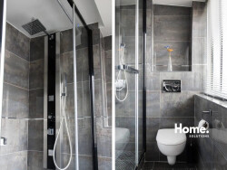 La salle d'eau, moderne et élégante, dispose d'une douche confortable, d'un meuble vasque et d'un WC intégré. Pensée pour allier praticité et esthétisme, elle complète harmonieusement cet appartement où chaque espace a été optimisé.