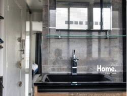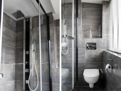 La salle d'eau, moderne et élégante, dispose d'une douche confortable, d'un meuble vasque et d'un WC intégré. Pensée pour allier praticité et esthétisme, elle complète harmonieusement cet appartement où chaque espace a été optimisé.