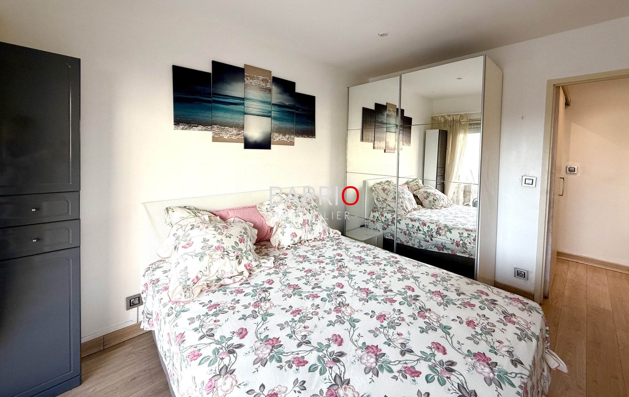 Le salon-séjour s'ouvre sur un balcon-terrasse profitant d'une vue dégagée avec aperçu mer. La seconde chambre, également dotée d'un placard, dispose de son propre balcon offrant la même vue.