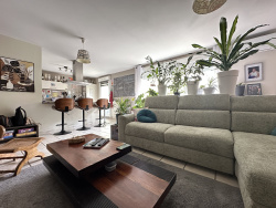 Séjour lumineux avec cuisine ouverte entièrement équipée, avec clim réversible, donnant sur terrasse de 15 m2 exposée sud avec store banne électrique.