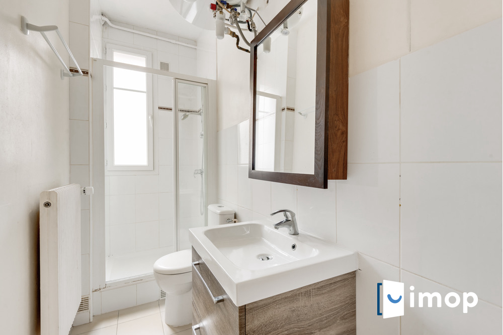 un coin nuit et table de travail avec vue dégagée sur les toits de Paris et d'autre part, un espace cuisine et salle d'eau avec toilettes aux normes. Deux fenêtres orientées Est et Sud laissent entrer le soleil aux beaux jours.