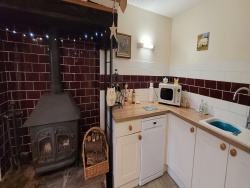 Au rez-de-chaussée : séjour/salle à manger avec poêle à bois, cuisine aménagée, coin buanderie, salle d'eau avec douche à l'italienne, baignoire et WC, ainsi qu'une chambre.