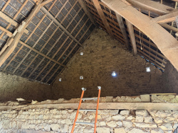 Auv 1212 : Maison avec grange attenante, garages et 6570m2 de terrain Cette belle maison en pierres naturelles peut être facilement remise en état d'habitation. Il y a deux cheminées dans lesquelles on peut installer un poêle à pellets ou un poêle à bois. Une extension dans la grange attenante est également possible. La plus grande moitié du terrain se situe du côté de la maison. Dans le joli jardin se trouve également un garage triple qui nécessite une rénovation. De l'autre côté du chemin en terre, il y a encore une belle parcelle de terrain avec une petite dépendance. On est donc assuré qu'aucune maison ne sera construite en face. Dans la maison, les fenêtres sont récentes et équipées de double vitrage. La fosse toutes eaux est conforme et ne nécessite qu'un entretien. Côté devant, il y a deux portes d'entrée. La cuisine fait 19m2. Il y a une cheminée pour un poêle, une petite cuisine équipée et, dans la continuité, un WC (1m2). Depuis la cuisine, on accède à la véranda (7,5m2), qui donne elle-même accès au jardin. Le séjour fait 31m2 et dispose d'une grande cheminée. Il y a beaucoup de finitions en bois et un beau sol en tomettes anciennes. La hauteur sous plafond au rez-de-chaussée est de 2m20. C'est également ici que se trouve l'escalier menant à l'étage. À l'étage, il y a trois chambres. La première chambre est plutôt petite et n'a pas de fenêtre, mais elle contient la trappe menant au grenier. Cette pièce fait 7m2. Ensuite, il y a une deuxième chambre (13m2) avec une fenêtre et également l'accès à la salle de bains. La salle de bains (3,5m2) est équipée d'un lavabo, d'un bidet et d'une petite baignoire. La plus grande chambre fait 19,5m2 et possède des fenêtres côté devant comme arrière. Il y a également un grenier sur toute la surface de la maison. Le plancher du grenier ainsi que la toiture sont isolés. À l'étage, la hauteur sous plafond est de 2m50. La grange attenante fait 50m2. Elle est classiquement divisée en deux espaces et possède, au-dessus de la seconde partie, un fenil. La hauteur au faîtage de la grange est de 7m60. De l'autre côté, dans le pré, se trouve une étable de 20m2. L'ancien garage situé dans le jardin arrière fait 44m2. Il possède une toiture en amiante et celle-ci est également endommagée ; une partie devra donc être remplacée. Cette dépendance pourrait cependant devenir très agréable, par exemple pour créer une terrasse couverte avec éventuellement une cuisine d'été. Le jardin arrière comprend déjà quelques arbres adultes ainsi que plusieurs arbres fruitiers, ainsi que différentes graminées ornementales. La toiture de la grange ainsi que celle de la maison sont en bon état.