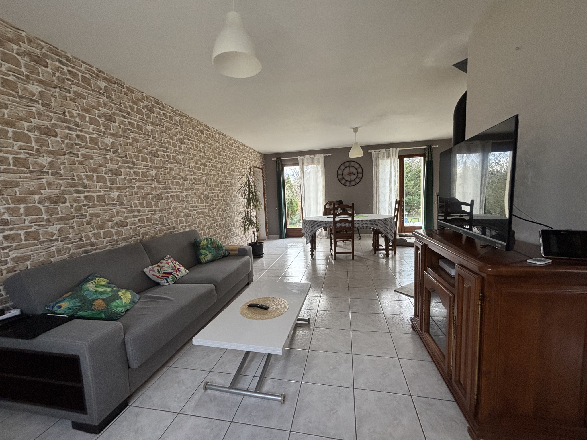 À l'extérieur, la cour avant permet le stationnement de plusieurs voitures ; l'arrière offre une terrasse goudronnée et un jardin comprenant un potager. Aucun travaux n'est à prévoir.