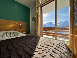 Quatre balcons rythment l'appartement et offrent chacun une vue ouverte sur la station et les montagnes.