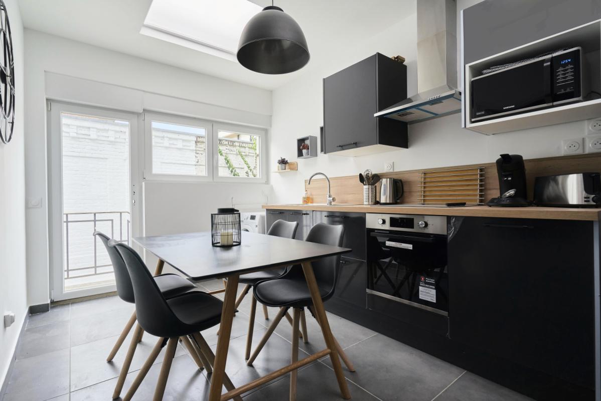 - D'une cuisine équipée avec machine à laver, sèche linge et vaisselle
