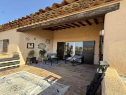 Un hall d'entrée avec WC et lave mains, dessert l'espace salon, salle à manger, cuisine ouverte équipée, et l'accès à l'étage. Le salon est climatisé, et donne sur une terrasse couverte pouvant accueillir une belle tablée de convives. Vous aurez accès à la piscine par des escaliers, donnant sur un espace Zen et cosy ombragé.