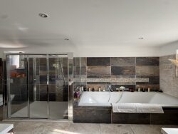 Dans le prolongement de la cuisine équipée, vous aurez accès à un espace buanderie avec douche, ainsi qu'à l'espace garage.