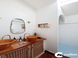 Beau potentiel pour cette maison de charme ! Maison atypique de plain-pied située dans un environnement calme, à proximité immédiate de toutes les commodités. D'une surface d'environ 130 m², cette maison est implantée sur une parcelle de 483 m². Elle offre un bel espace de vie comprenant un salon-séjour ouvert sur la cuisine, prolongé par une salle à manger confortable et lumineuse. L'espace nuit se compose de trois chambres spacieuses, de deux salles d'eau indépendantes ainsi que d'un grand dressing. Dès l'entrée, un vaste vestibule propose de nombreux rangements. Dans son prolongement, un bureau vient compléter l'ensemble, pouvant également faire office de chambre d'appoint. À l'extérieur, un jardin exposé Est/Ouest faisant le tour de la maison offre un espace agréable à exploiter. Deux places de stationnement à l'intérieur de la parcelle complètent ce bien. Possibilité de créer un Carport. À noter : les extérieurs nécessitent des travaux.