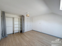 À l'étage, une vaste chambre avec de nombreux rangements en mezzanine