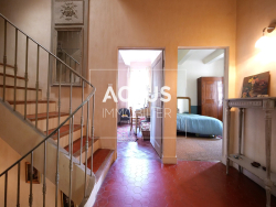 Le hall d'entrée dessert d'un côté la pièce de vie de plus de 80 m² composée d'un vaste salon avec cheminée, d'une salle à manger et d'un salon tv. De l'autre, se trouve la cuisine provençale avec son arrière-cuisine, faisant office de buanderie. Les volumes sont très généreux et baignés de lumière. Une jolie baie du salon donne accès au jardin ombragé naturellement par de grands arbres.