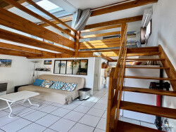 Pavillon 2 pièces Mezzanine d'environ 32,17m² (28,44m² loi CARREZ) avec aperçu MER, une Belle Terrasse de 34m², parking privé et Piscine dans la résidence. Comprenant: séjour avec coin cuisine équipée avec accès sur la mezzanine, salle d'eau, W.C. Séparé. À l'étage: une grande mezzanine avec un grand lit, un grand placard et un canapé lit. Équipements: Double vitrage/ Climatisation réversible double split / Expo Sud-Est / Entièrement équipé - meublé / Très jolie résidence! Situé à moins de 600m de la plage et des commerces. À NE PAS MANQUER !!